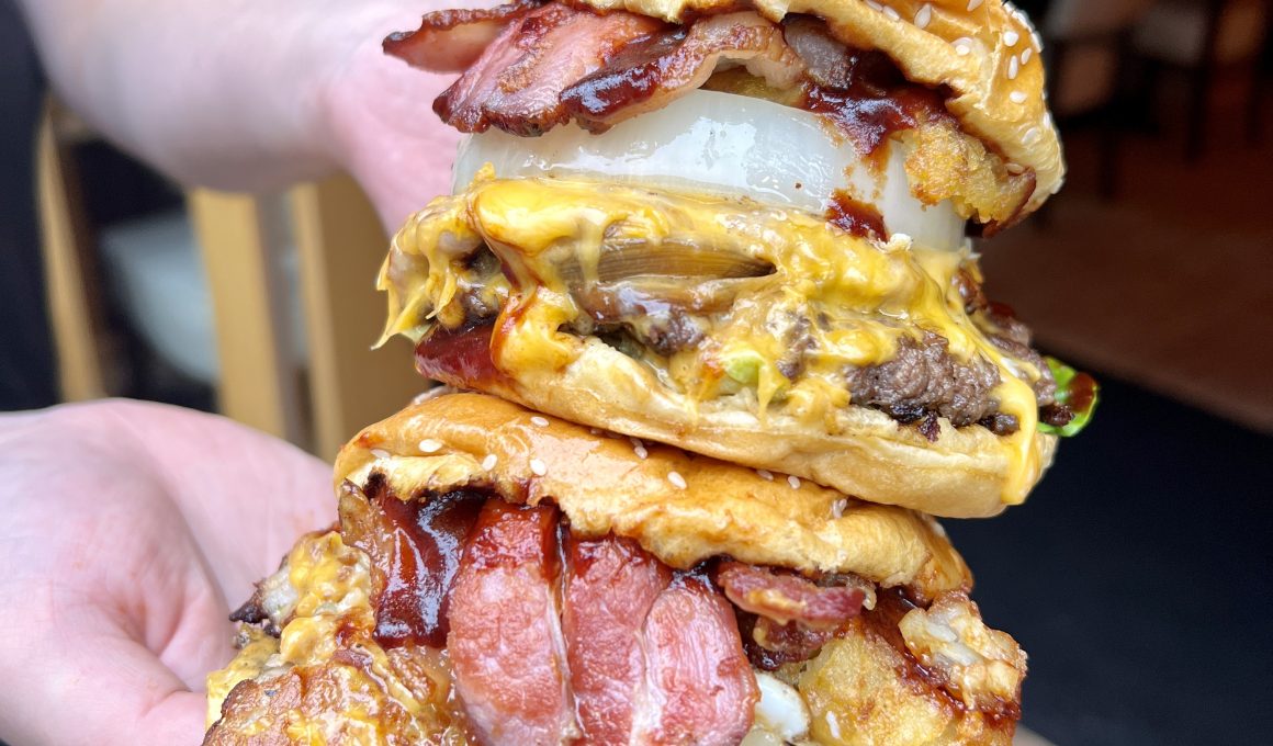 Think two beef and sausage patties locally sourced meat from local butcher legends Malcolm Michaels Butchers, before being topped with a layer of streaky bacon and that’s before we’ve even considered the pun-related toppings.