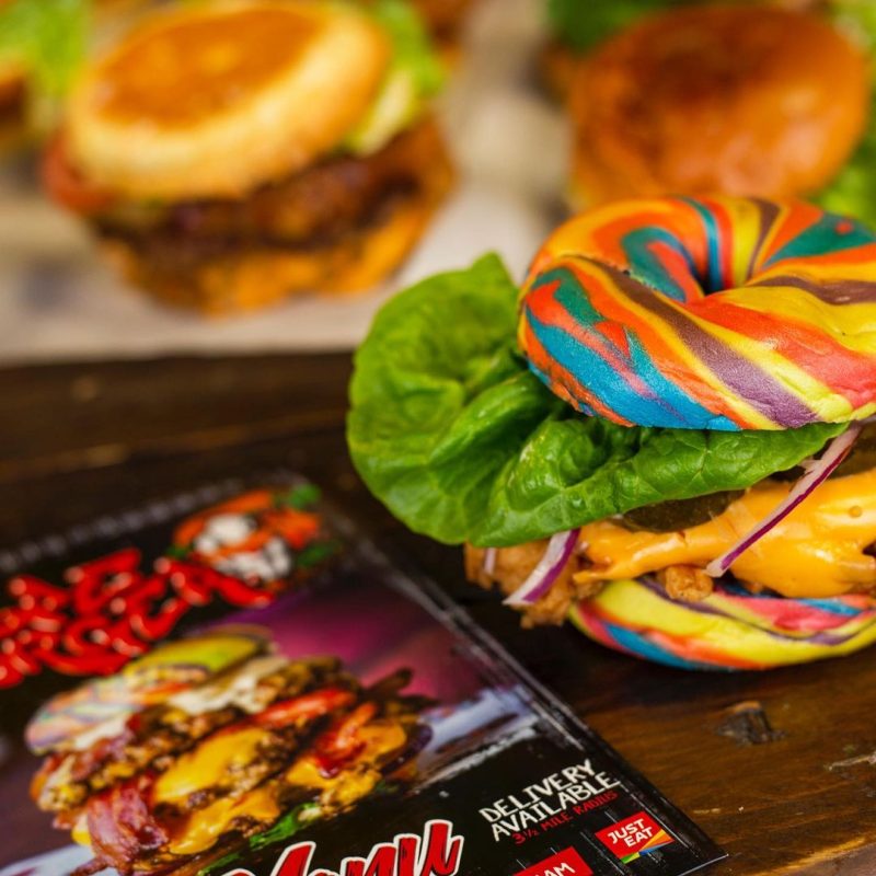 Giant burgers with toppings like brisket and blue cheese between two neon rainbow burger ......