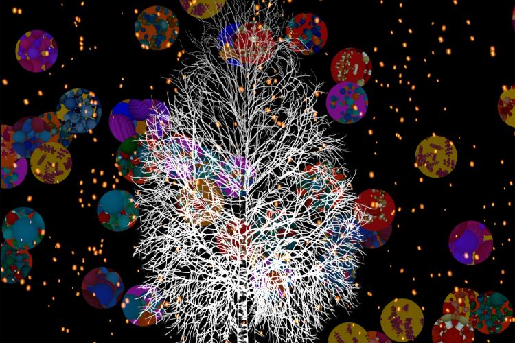This interactive projection explores themes of climate change through mesmerising imagery. It reveals greenhouse gases which are invisible to the naked eye and invites us to actively engage with the molecules as they float up into the atmosphere. The artwork evokes the natural world through exquisitely drawn images of the trees, accompanied by the sounds of nightingales.